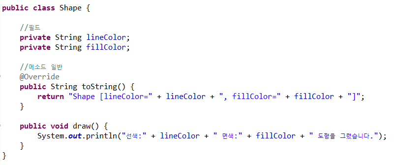 Ractangle 클래스에는 Shape 클래스의 메소드와 동일한 이름의 메소드(toString, draw)가 있습니다.